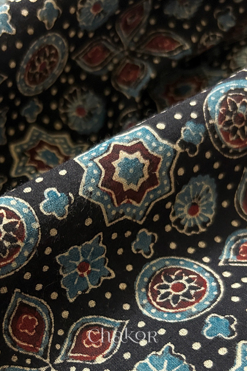 Handcrafted Ajrakh kurta fabrics printed using traditional hand block techniques in Kutch,...