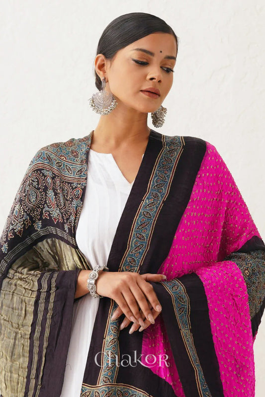 Pink Black Bandhani Ajrakh Silk Dupatta