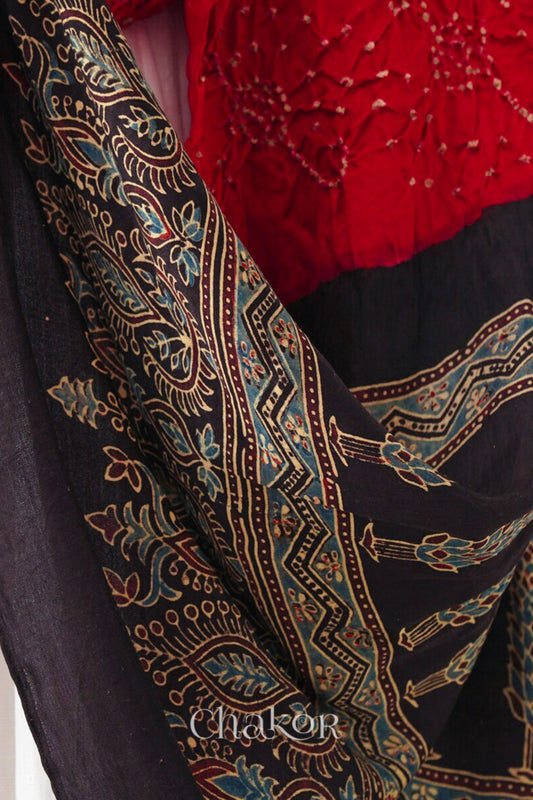 Red Black Bandhani Ajrakh Silk Dupatta