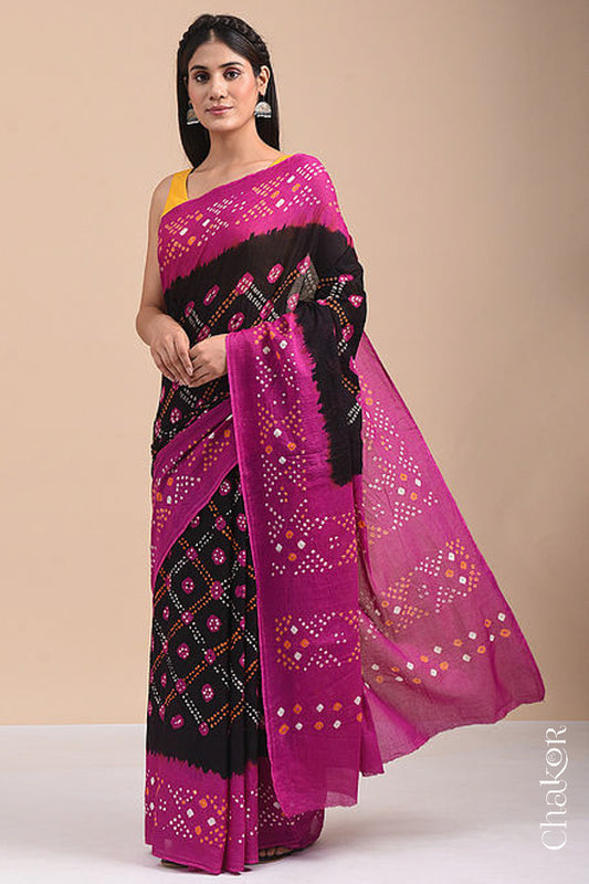 Black Mehendi Green Bandhani Mul Cotton Saree