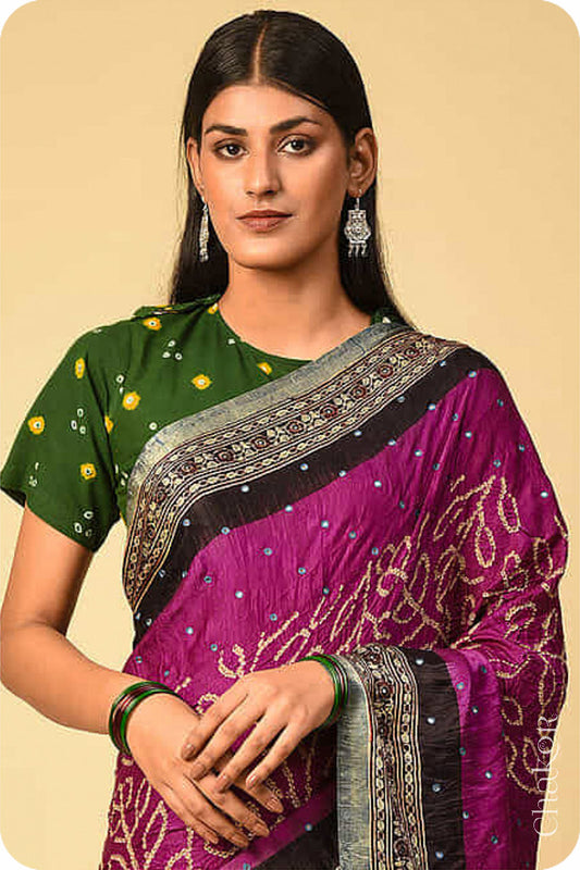 Magenta Black Bandhani Ajrakh Silk Saree