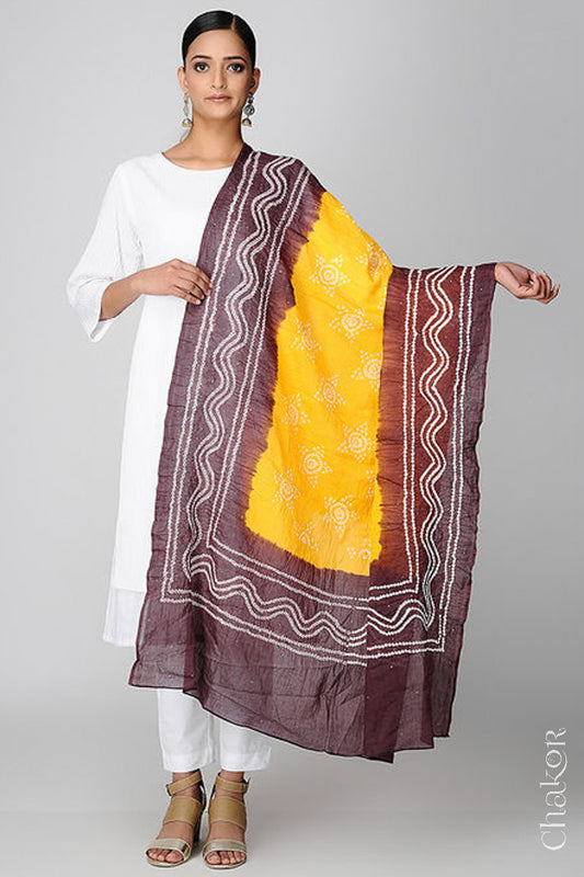 Yellow Brown Bandhani Mul Cotton Dupatta