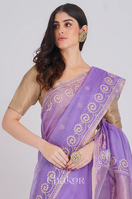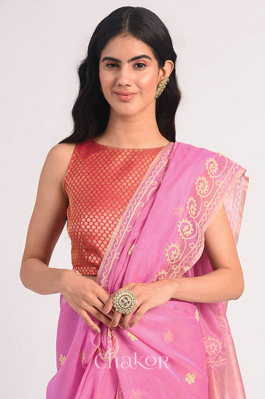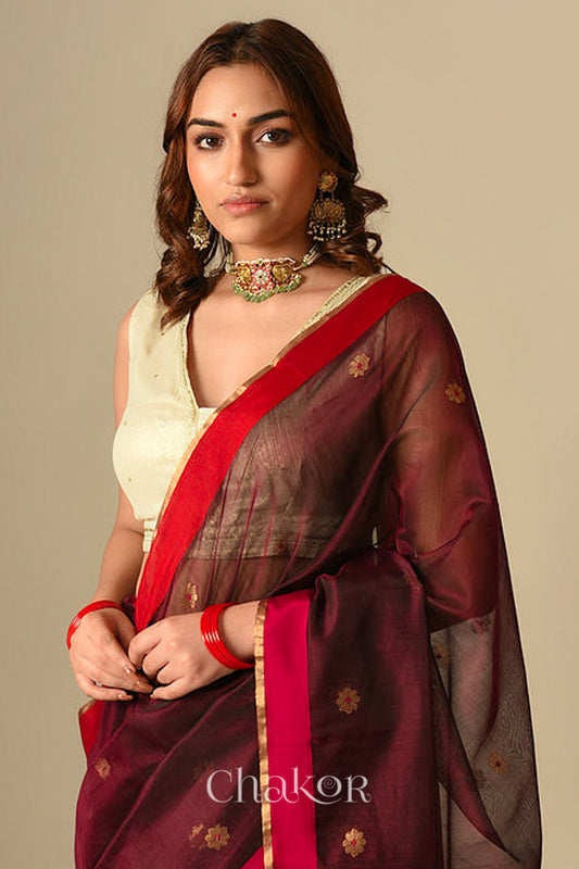 The translucent quality of Chanderi fabric is achieved through the use of fine silk & mercerised cotton threads in the warp and weft, creating a delicate and ethereal appearance. The incorporation of zari adds a touch of opulence, making Chanderi sarees a sought-after choice for special occasions.
