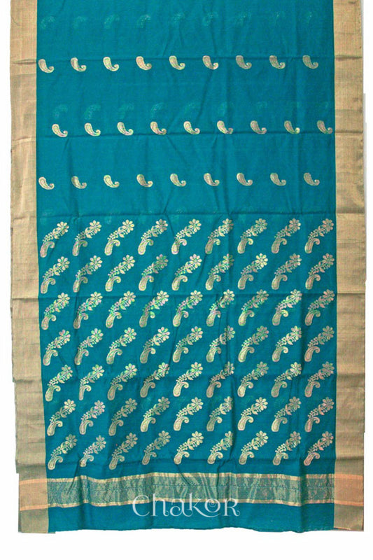 What sets Chanderi apart is its unique blend of silk, cotton, and zari (fine metallic thread). The weaving process involves a combination of handloom and Jacquard techniques, ensuring precision and attention to detail. Chanderi sarees are characterized by sheer texture, fine silk yarns, and intricate patterns, often featuring motifs inspired by nature, such as peacocks, flowers, and geometric designs.