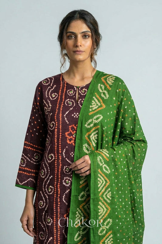 Brown Green Bandhani Cotton Tunic Pant Set with Dupatta | Handcrafted in Kutch