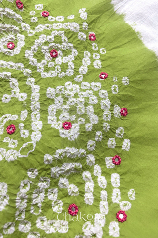 Off-white & Lime Green Bandhani Cotton Mirror Embroidered Kurta Fabric with Dupatta (Set of 3)