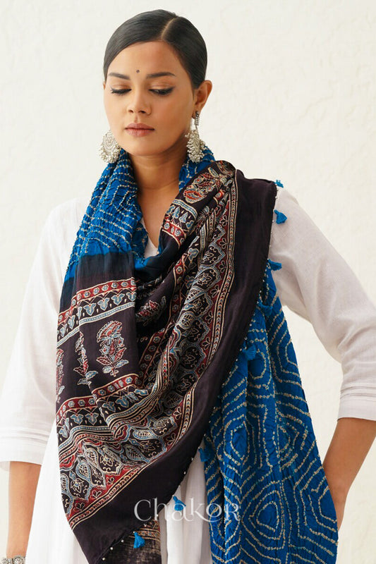 Indigo Black Bandhani Ajrakh Silk Dupatta