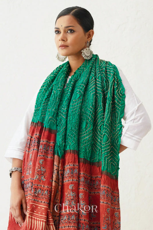 Jade Red Bandhani Ajrakh Silk Dupatta