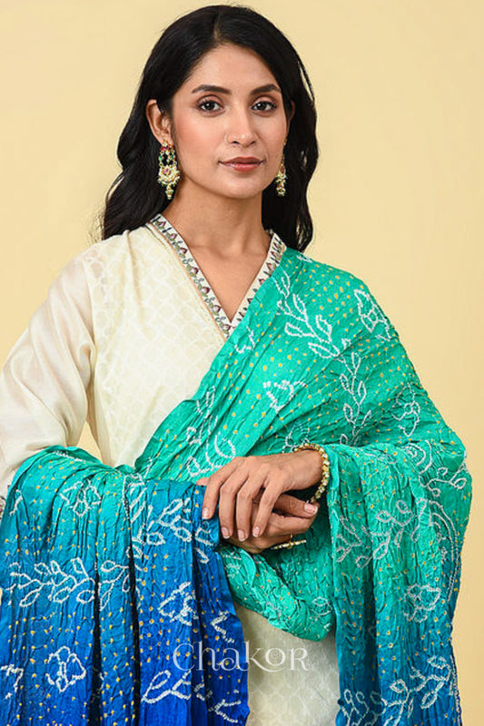 Sea Green Blue Ombre Bandhani Gaji Silk Dupatta