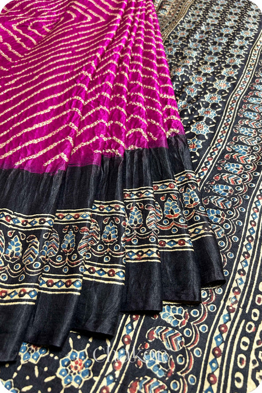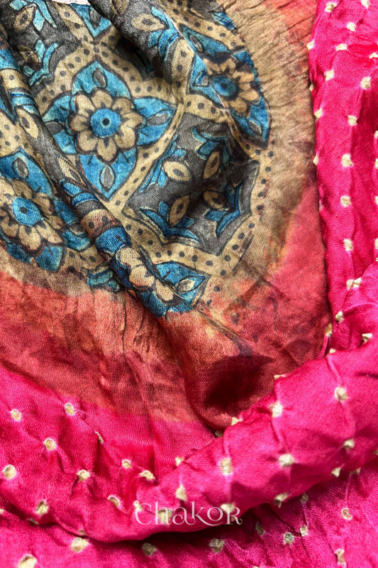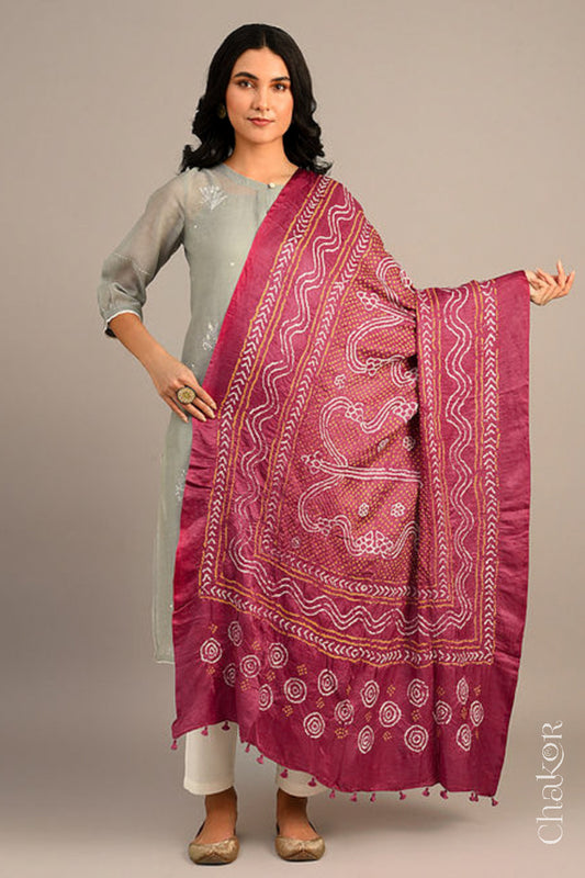 Magenta Bandhani Ajrakh Gaji Silk Dupatta | Handmade Bandhej from Kutch
