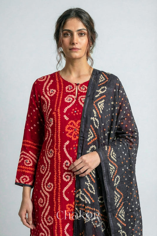 Red Gray Bandhani Cotton Tunic Pant Set with Dupatta | Handcrafted in Kutch