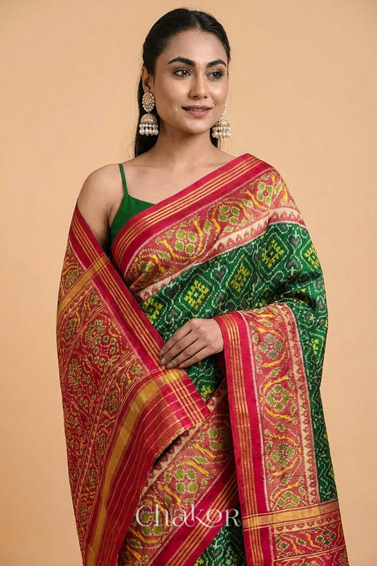 CHAKOR proudly presents a captivating collection of meticulously handwoven Patola sarees & dupattas, embodying Gujarat's rich heritage. Our commitment to showcasing this ancient art form blends tradition with contemporary elegance, evident in vibrant colors and intricate Ikat patterns. These sarees, steeped in centuries-old craftsmanship, enchant textile aficionados. Each piece stands as a testament to the enduring artistry of Ikkat weaving, celebrating Gujarat's cultural legacy. Explore the timeless allure of Patola with CHAKOR, where tradition and style harmoniously unite in every meticulously crafted saree. Experience the journey of cultural richness and craftsmanship with our exquisite Patola collection.