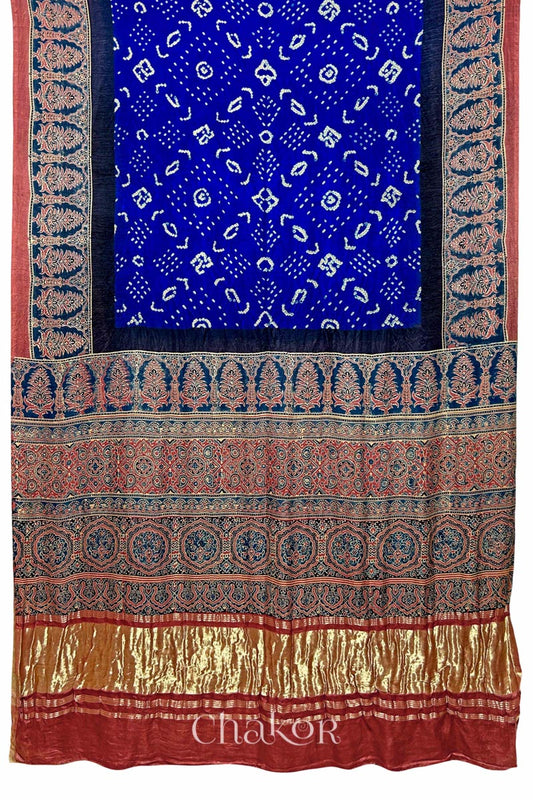 Blue Red Bandhani Ajrakh Silk Saree