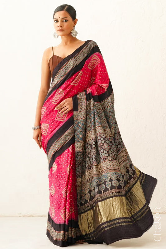 Magenta Black Bandhani Ajrakh Silk Saree