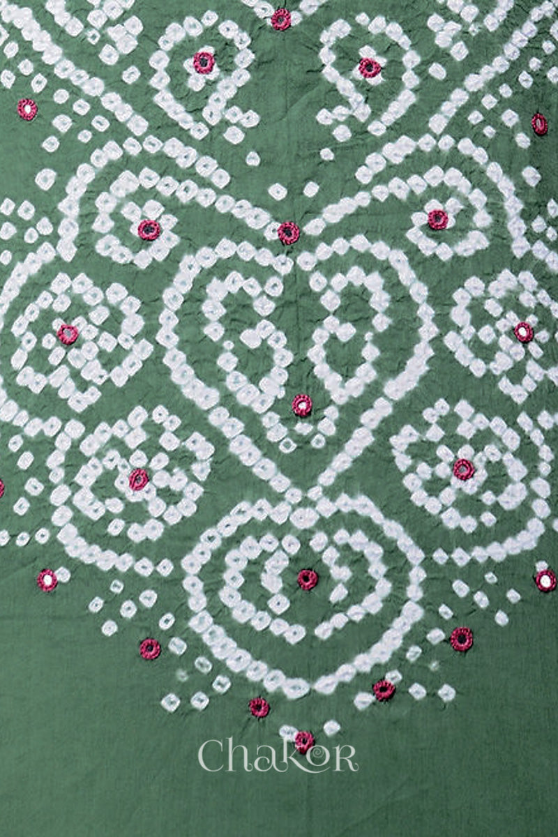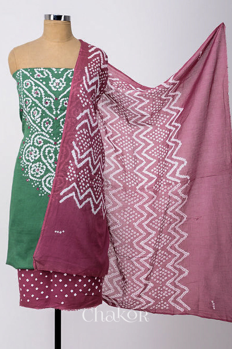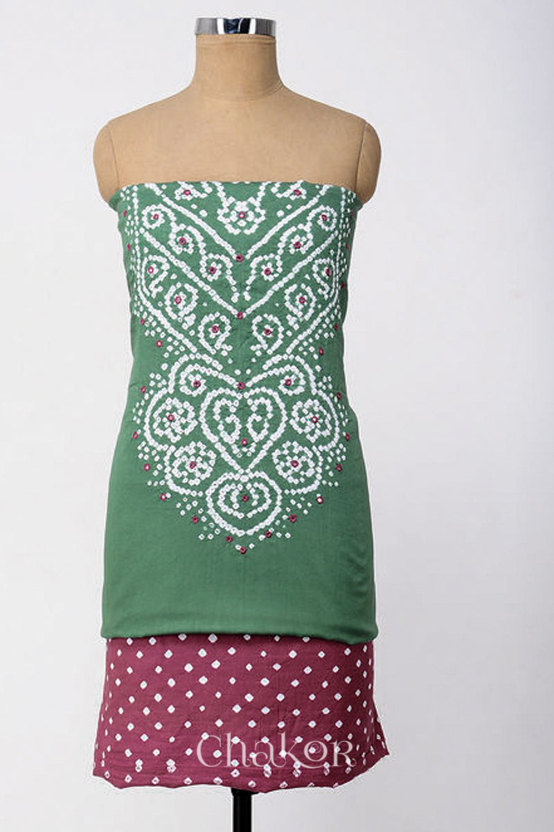 Moss Green Plum Bandhani Cotton Mirror Embroidered Kurta Fabric with Dupatta (Set of 3)