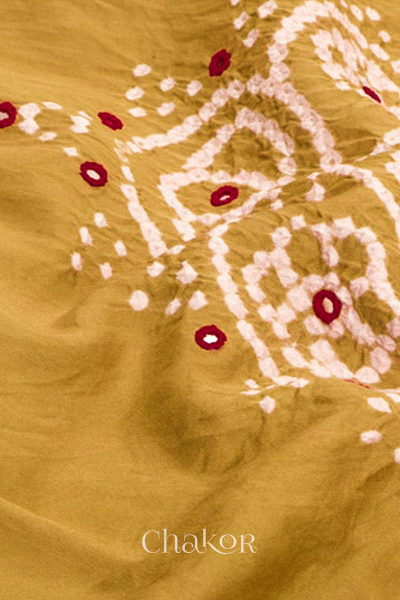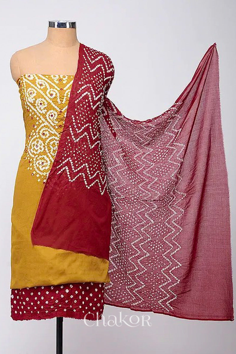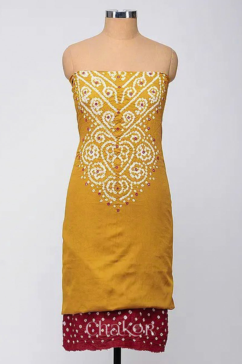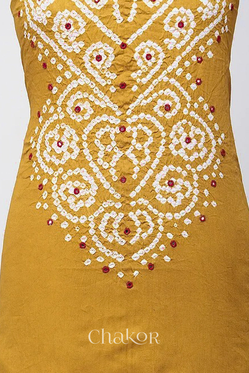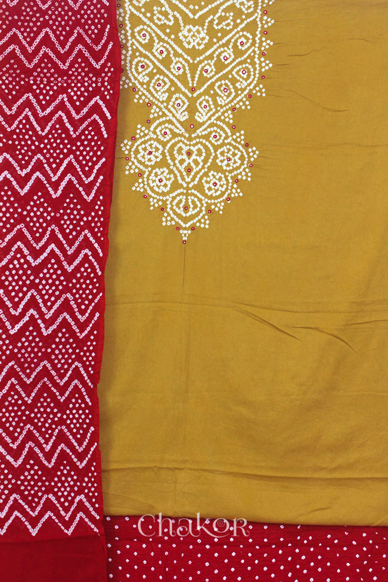Mustard Red Bandhani Cotton Mirror Embroidered Kurta Fabric with Dupatta (Set of 3)